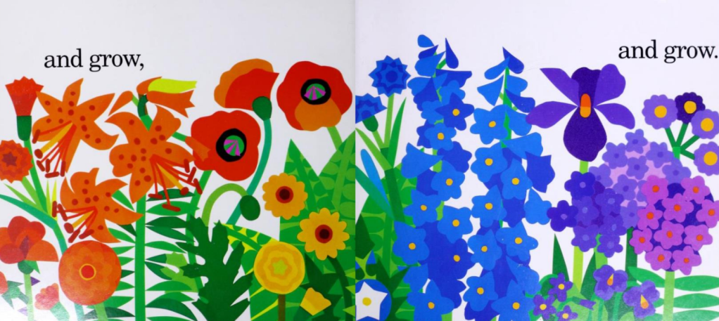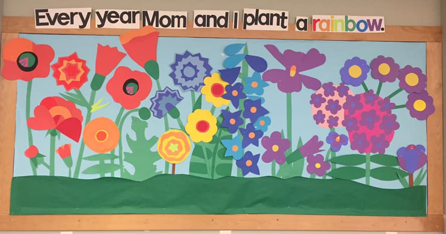 How I made it: This board is inspired by Lois Elhert’s flowery, bright & oh-so-colorful book Planting a Rainbow. I tried my very best to make the flowers look like the flowers as they are painted in the book. The book features collage-style, abstract shapes that make up the mother and daughter’s beautiful rainbow garden, and that’s the style I attempted to emulate here. The first sentence in the book is: “Every year Mom and I plant a rainbow,” so that’s the sentence I featured above the board. I saw this done on this board I spotted on Pinterest, and I like it because I think it draws attention to the fact that it’s inspired by Planting a Rainbow.